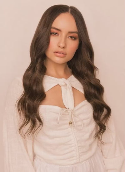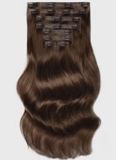 Our 20” Seamless Clip-In Hair Extensions in Mocha Brown blend effortlessly for a flawless finish. Crafted with ultra-lightweight, invisible wefts, they lie flat against the scalp for a discreet and comfortable fit. Made from the highest grade 100% genuine Remy human hair, these extensions deliver silky softness, natural movement, and long-lasting wear. Each weft features premium metal clips lined with silicone for a secure, gentle hold that stays in place all day.