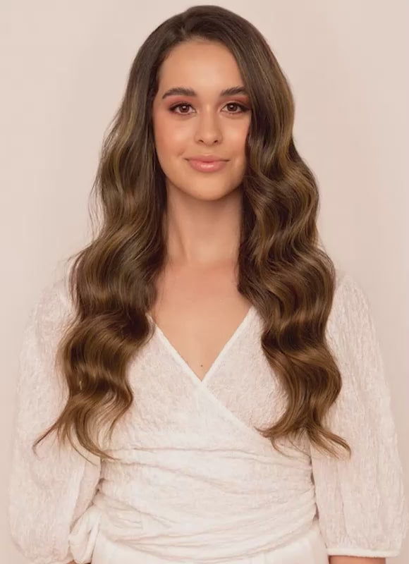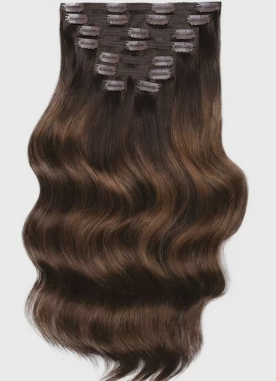 Our 20” Seamless Clip-In Hair Extensions in Mocha & Medium Brown Balayage blend effortlessly for a flawless finish. Crafted with ultra-lightweight, invisible wefts, they lie flat against the scalp for a discreet and comfortable fit. Made from the highest grade 100% genuine Remy human hair, these extensions deliver silky softness, natural movement, and long-lasting wear. Each weft features premium metal clips lined with silicone for a secure, gentle hold that stays in place all day.