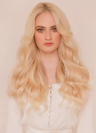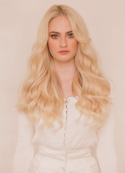 Indulge in the thickest, most luxurious hair extensions we offer — our 20 inch Ultimate Volume Clip-In Hair Extensions in Light Blonde. Crafted from double drawn, 100% cuticle-aligned Remy human hair, these premium extensions deliver exceptional thickness from top to ends, a soft, silky feel, and stunning, natural-looking volume.