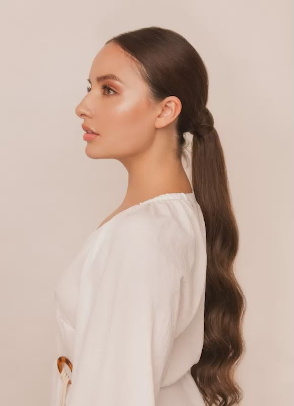 The clip and wrap-around design makes application quick and secure. Simply clip the extension over your natural ponytail and wrap the integrated strand of hair around the base for a seamless, polished finish.