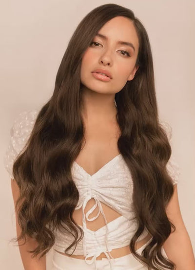 Achieve fuller, thicker hair in seconds with our 22 inch Halo Hair Extensions in Mocha Brown. Crafted from 100% Remy human hair, this innovative one-piece extension offers a comfortable, lightweight, and temporary alternative to traditional methods like clips, glues, beads, and weaves.
