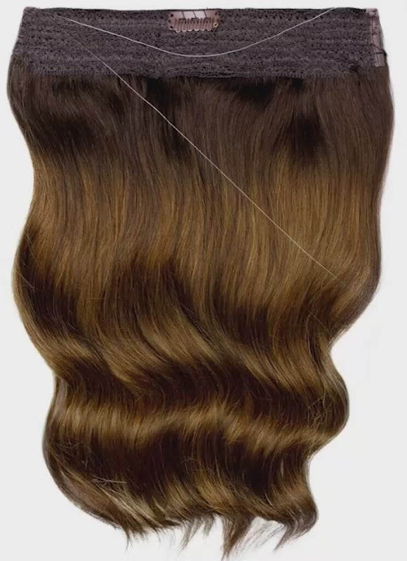Achieve fuller, thicker hair in seconds with our 22 inch Halo Hair Extensions in Mocha & Medium Brown. Crafted from 100% Remy human hair, this innovative one-piece extension offers a comfortable, lightweight, and temporary alternative to traditional methods like clips, glues, beads, and weaves.