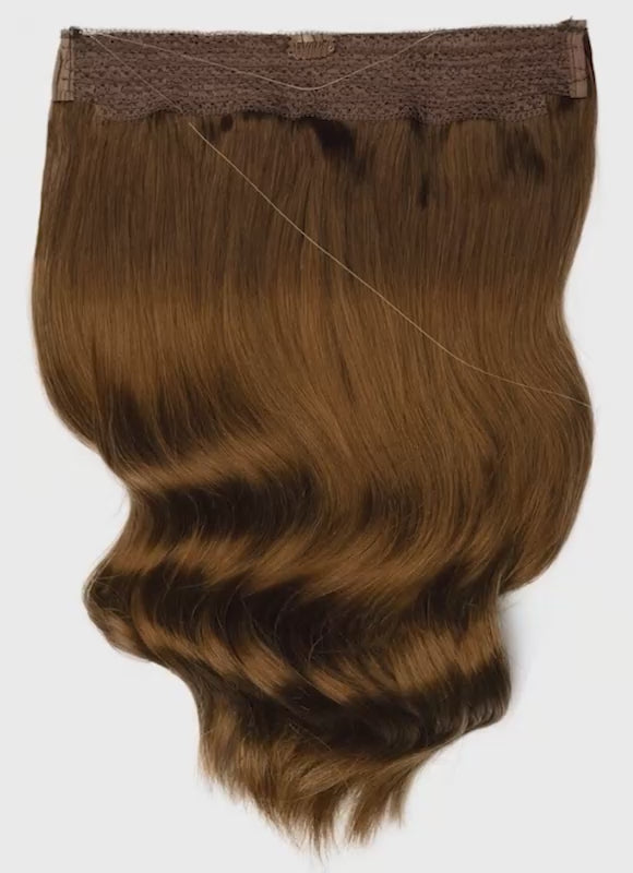 Achieve fuller, thicker hair in seconds with our 22 inch Halo Hair Extensions in Dark to Medium Brown Ombre. Crafted from 100% Remy human hair, this innovative one-piece extension offers a comfortable, lightweight, and temporary alternative to traditional methods like clips, glues, beads, and weaves.