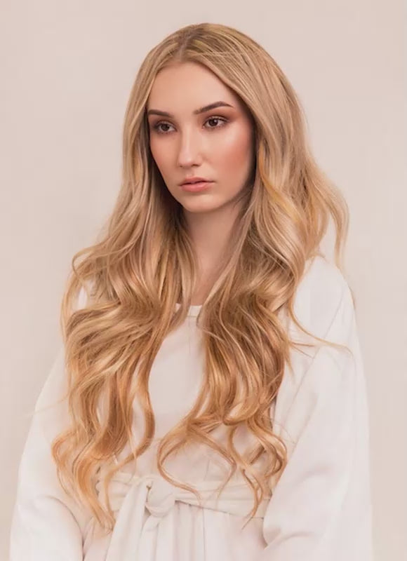 Take your look to the next level with our 24 inch Deluxe Clip-In Hair Extensions in Light Brown with Light Blonde Highlights. Crafted from the highest grade 100% genuine Remy human hair, these premium extensions provide luxurious length, volume, and a soft, silky finish that blends seamlessly with your natural hair.