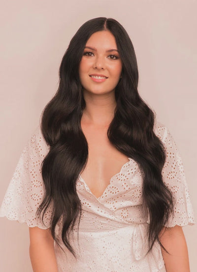 Indulge in the thickest, most luxurious hair extensions we offer — our 24 inch Ultimate Volume Clip-In Hair Extensions in Natural Black. Crafted from double drawn, 100% cuticle-aligned Remy human hair, these premium extensions deliver exceptional thickness from top to ends, a soft, silky feel, and stunning, natural-looking volume.