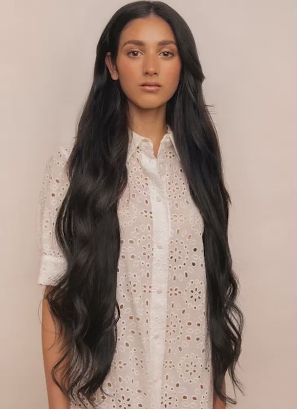 Experience unparalleled length and volume with our 30 inch Ultimate Volume Clip-In Hair Extensions in Jet Black. Crafted from the highest grade 100% Remy human hair, these extensions are double drawn and cuticle-aligned, ensuring thickness from root to tip and a silky, tangle-free finish.