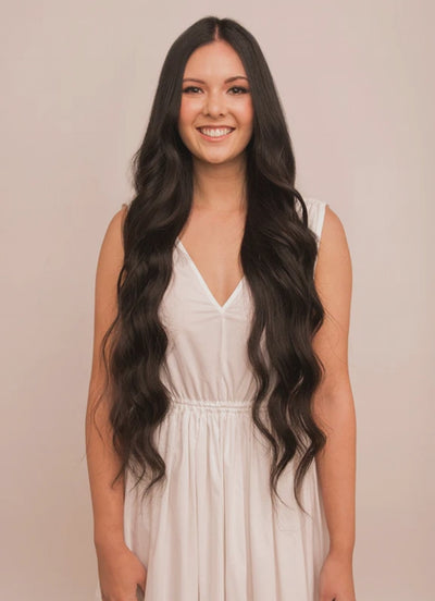 Experience unparalleled length and volume with our 30 inch Ultimate Volume Clip-In Hair Extensions in Natural Black. Crafted from the highest grade 100% Remy human hair, these extensions are double drawn and cuticle-aligned, ensuring thickness from root to tip and a silky, tangle-free finish.